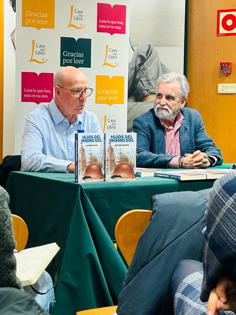 Interés y excelente receptividad la que constatamos en Vitoria-Gasteiz hacia la novela Hijos del mismo sol, de Javier Maura, que fue presentada en la Casa del Libro el jueves 15 de febrero. El periodista y escritor local Emilio Alfaro, que condujo el acto, defendió que en esta obra, finalista del I Premio de Novela Histórica de Vallirana, hay dos grandes personajes: Nicolás Rosal, un hombre anodino que se ve envuelto en una circunstancia que le obliga a cambiar su vida radicalmente, y (el segundo personaje) la propia ciudad de Madrid, una urbe sitiada que se transforma y evoluciona por necesidad, donde la vida cotidiana como se entendía antes del 18 de julio de 1936 desaparece y surgen nuevas necesidades y comportamientos, desde la aparición de héroes hasta la proliferación de sinvergüenzas. Por su parte, Javier Maura planteó su tesis de que «hay múltiples guerras en una guerra, tantas como personas afectadas», con lo cual el conflicto se vuelve multiforme y poliédrico, más allá de las batallas y las intrigas políticas, que son las que suelen explicar los manuales. El autor explicó también cómo la excepcionalidad del conflicto transforma y altera profundamente a quienes lo sufren: «La rutina de la guerra para un ciudadano cualquiera consiste en no saber si verá la luz del día siguiente, por lo que cambia radicalmente su forma de ver la vida y eso le lleva a liberarte en cierta manera». Javier Maura también explicó el sentido del título de la novela, que surge de un discurso de Azaña sobre el significado del sentimiento patriótico y puso en contexto la actualidad de ese concepto.