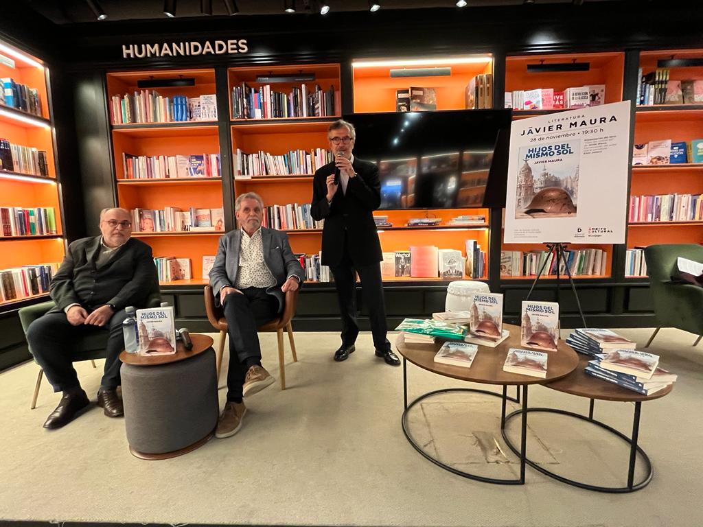 Fue una tarde para aprender historia, novela e incluso aprender las lecciones de la actualidad. Todo esto pudo aprenderse en la estimulante presentación en Madrid de Hijos del mismo sol, de Javier Maura. Se llenó la sala de la librería de El Corte Inglés de Castellana, con una cincuentena de personas dispuestas a escuchar a un autor que ha sabido «dibujar primero el marco para pintar luego el cuadro», en gráfica autodefinición de su trabajo en esta novela histórica, que logró ser finalista del I Premio de Vallirana. Le acompañó el gran periodista Enric Juliana, que habló de «heridas que aún no se han cerrado» y sugirió ideas para suturarlas. Ambos fueron presentados por el editor de DIËRESIS, José Ángel Martos. Entre el público, la también responsable de la editorial Teresa Amiguet, así como escritores de la talla de José Ángel Mañas, periodistas de primer nivel, como Ignacio Cembrero, y destacadas profesionales del mundo editorial como Beatriz Celaya (Alt Editores), Maribel Riaza (Storytel), o Patricia Ibáñez (Trama Editorial).